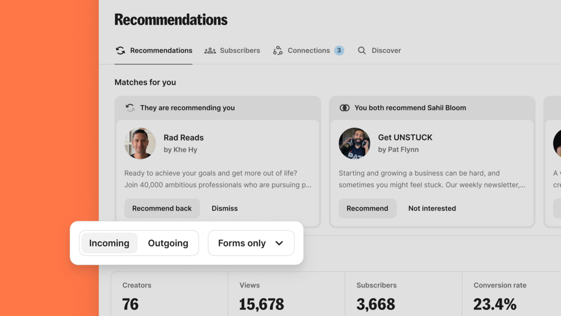 Your Recommendations used to live across two separate pages. Now incoming and outgoing matches are in one place—so you can see exactly where your list growth is coming from, and act on it faster.